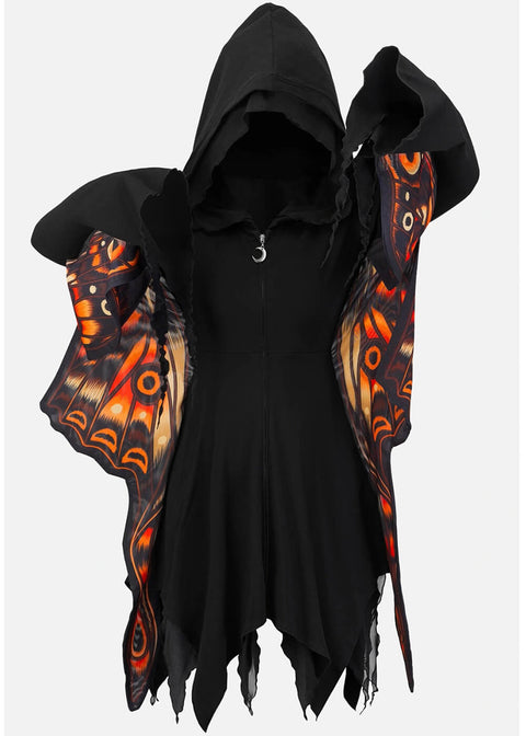Die feurigen Mottenschwingen auf der Rückseite erweitern sich wunderbar in orangenen und tiefbraunen Tönen, als würden sie im Licht eines Lagerfeuers unter dem Mond glühen! Die große Kapuze verleiht einen magischen Dark-Fairy-Look, während das weiche Innenfutter ihn angenehm bequem macht. Ein bezaubernder Hoodie für alle, die ihren Gothic-Stil mit einem Hauch von Waldhexe, Feuerfalter und nächtlicher Fantasie kombinieren...