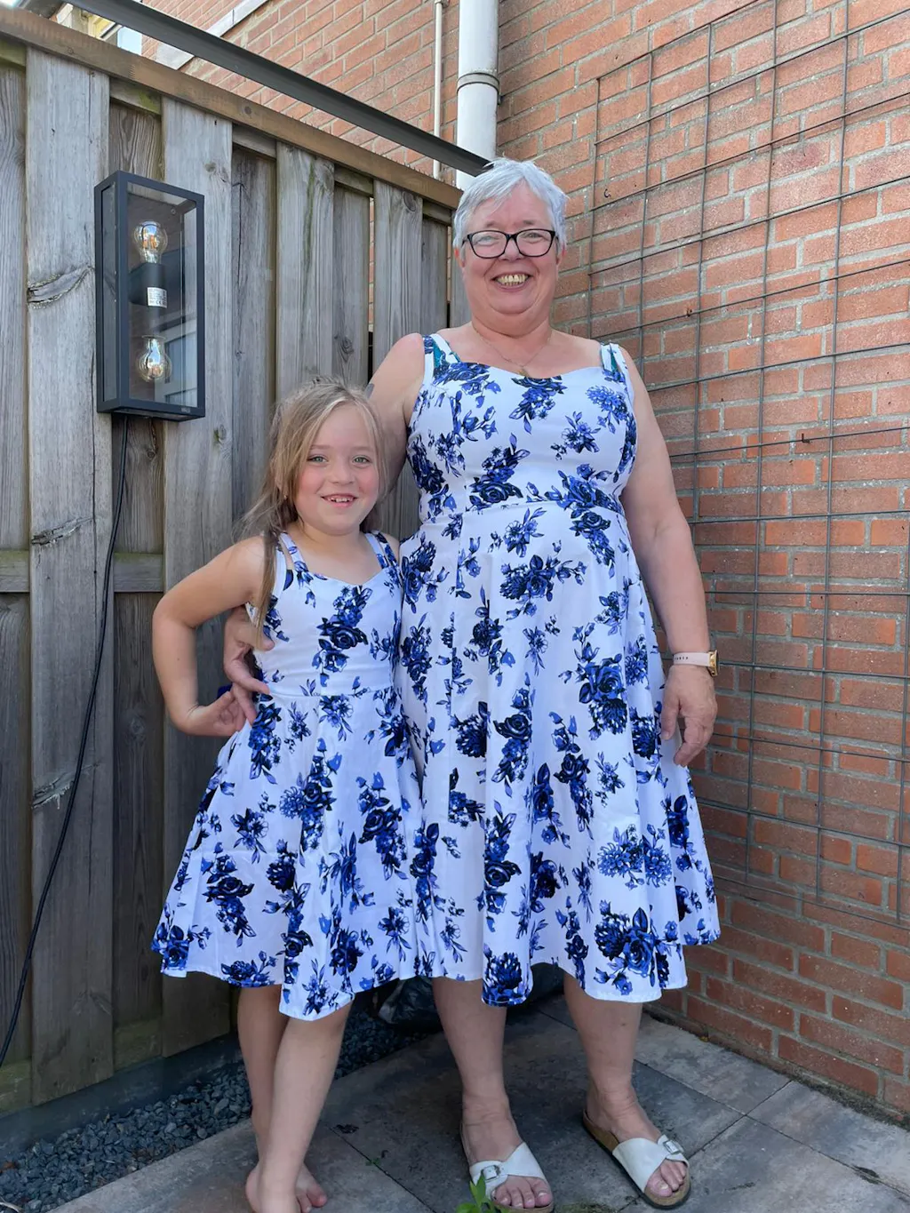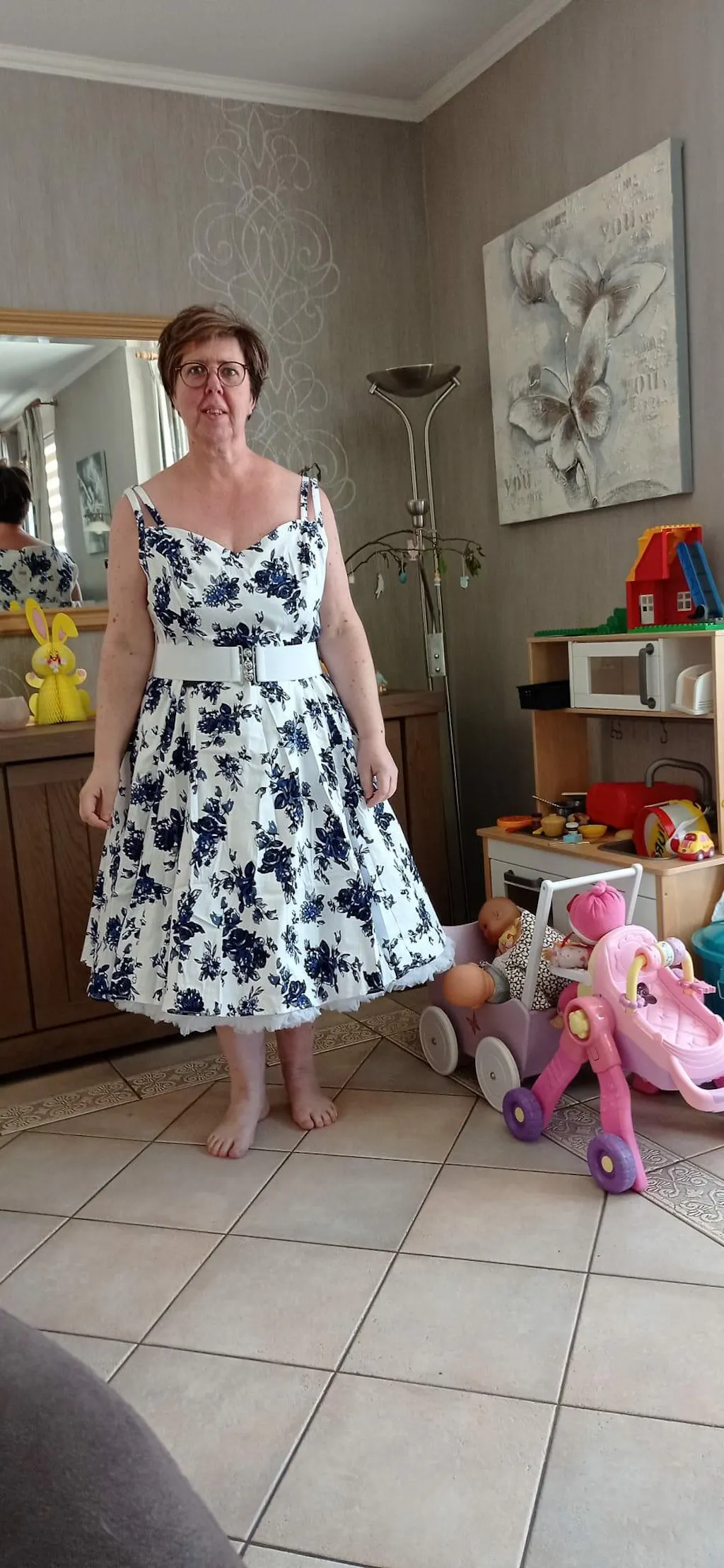 The white cotton almost makes the blue flowers seem like a painting. A cute detail are the two double shoulder straps on the front. While the back is high up. The bodice is nice and form fitting and from the waist down she flows inot a full skirt, which is perfect to combine with one of our petticoats for a festive effect. With a height of 1.70 she reaches below the knee and closes with a zipper on the side. The dress is made of a lovely quality cotton with a slight stretch.