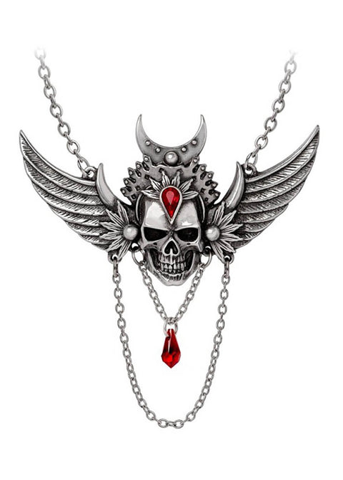 Immortal Ayesha embodies pure gothic splendor: a menacing, stylized skull as the centerpiece, ignited by deep red crystal that appears to still be glowing. Below the pendant dangles a red dropper and a piece of chain that sways with every step — a small detail with a significant impact.